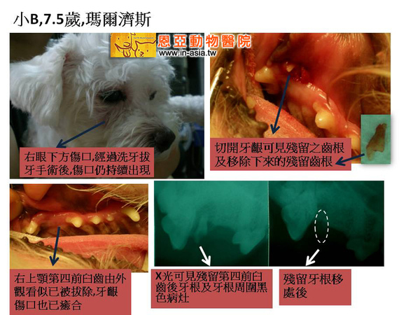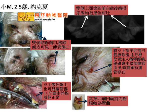經過齒科x 光檢查後發現他們的問題都是牙根發炎導致形成臉部瘻管,