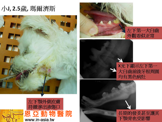 小J同樣為2.5歲瑪爾濟斯在左下顎外側有一微腫不癒合的傷口,