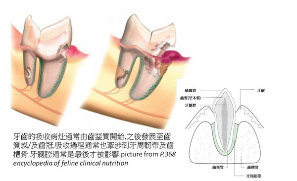 而出現蛀牙(caries)的狀況是完全不同的.目前引起貓齒吸收病的原因仍不清楚,